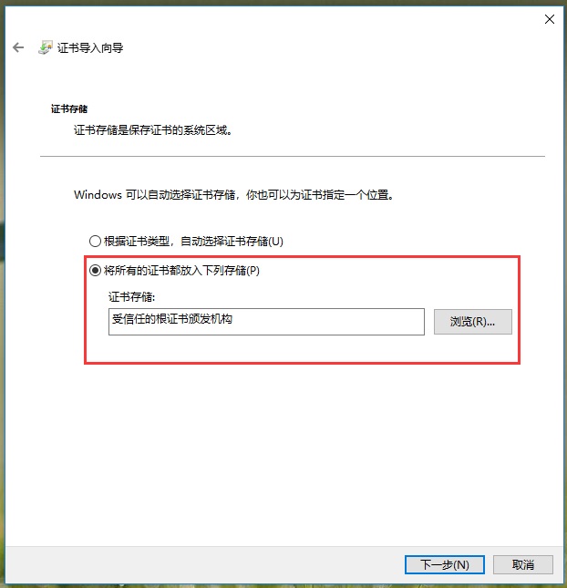 3、選擇“將所有證書放入以下存儲中(Place all Certificates in the following store)” > 點擊“瀏覽” > 選擇“受信任的根證書頒發(fā)機構(gòu)(Trusted Root Certification Authorities)” > 點擊“確定” > 然后點擊“下一步”;